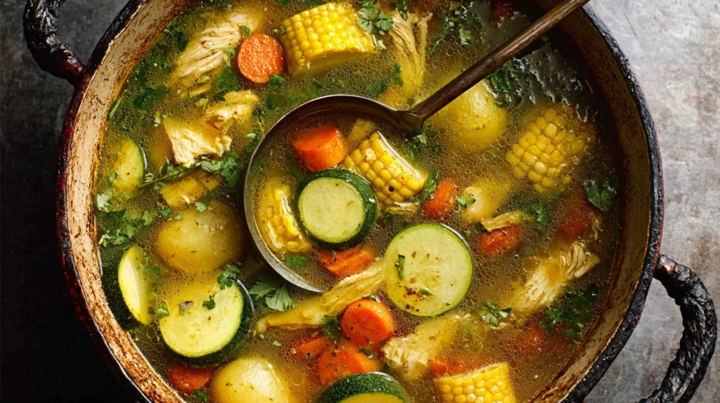 - Add Vegetables: Add carrots and potatoes and cook 10 minutes. Add corn and chayote and cook another 5 minutes. Add zucchini and cook 5 more minutes until all vegetables are tender.