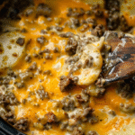 - Layer & Add Sauce: In the crockpot, layer half the potatoes, then half the beef-onion mixture, and some shredded cheddar cheese. Repeat the layers. In a bowl, whisk together the cream of mushroom soup, milk, garlic powder, salt, and pepper, then pour it evenly over the layers.
