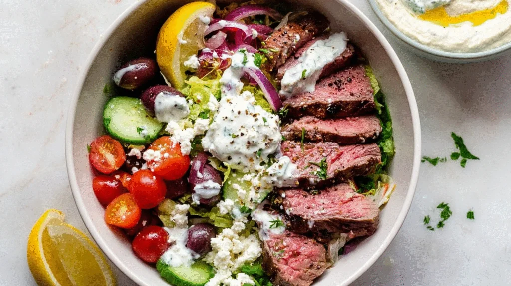 - Assemble the Bowl: Layer your choice of grains (such as rice, quinoa, or bulgur), then top with the sliced steak and desired toppings (like vegetables or herbs). Finish with a generous spoon of tzatziki and a drizzle of vinaigrette before serving.