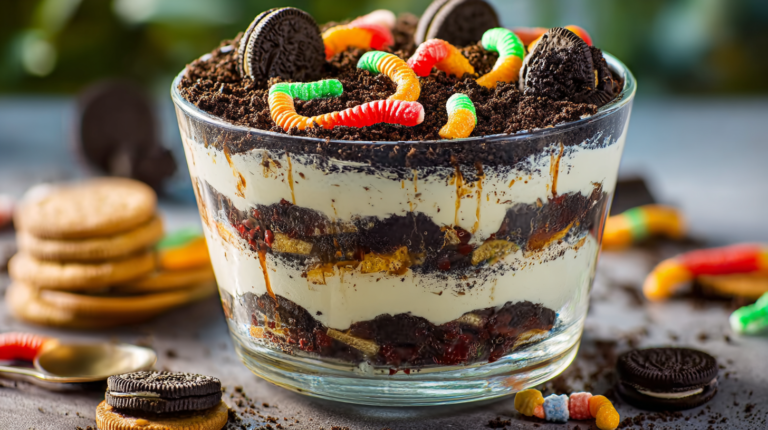 This dirt cake recipe is creamy, chocolatey, and so fun to serve. It’s a no-bake dessert made with crushed Oreos, chocolate pudding, and a fluffy cream cheese layer — then topped with gummy worms for the classic “dirt” look. It’s…