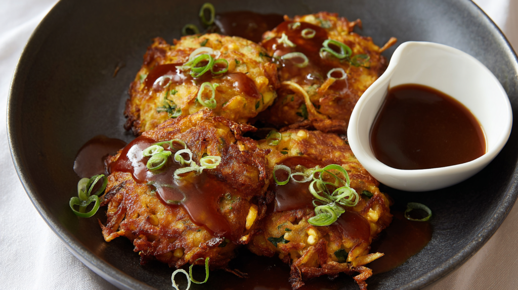 - Make the gravy: In a small saucepan, bring chicken broth, oyster sauce, soy sauce, sugar, and sesame oil to a simmer. Stir in the cornstarch slurry and cook 1–2 minutes until thick and glossy. Pour gravy over the patties and garnish with green onions.
